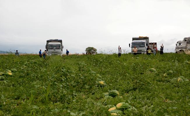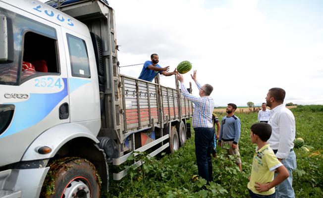 Çiftçiler bostandan yapılan ilk hasat karpuzları, vatandaşlara ikram edilmek üzere kamyonete yükledi.